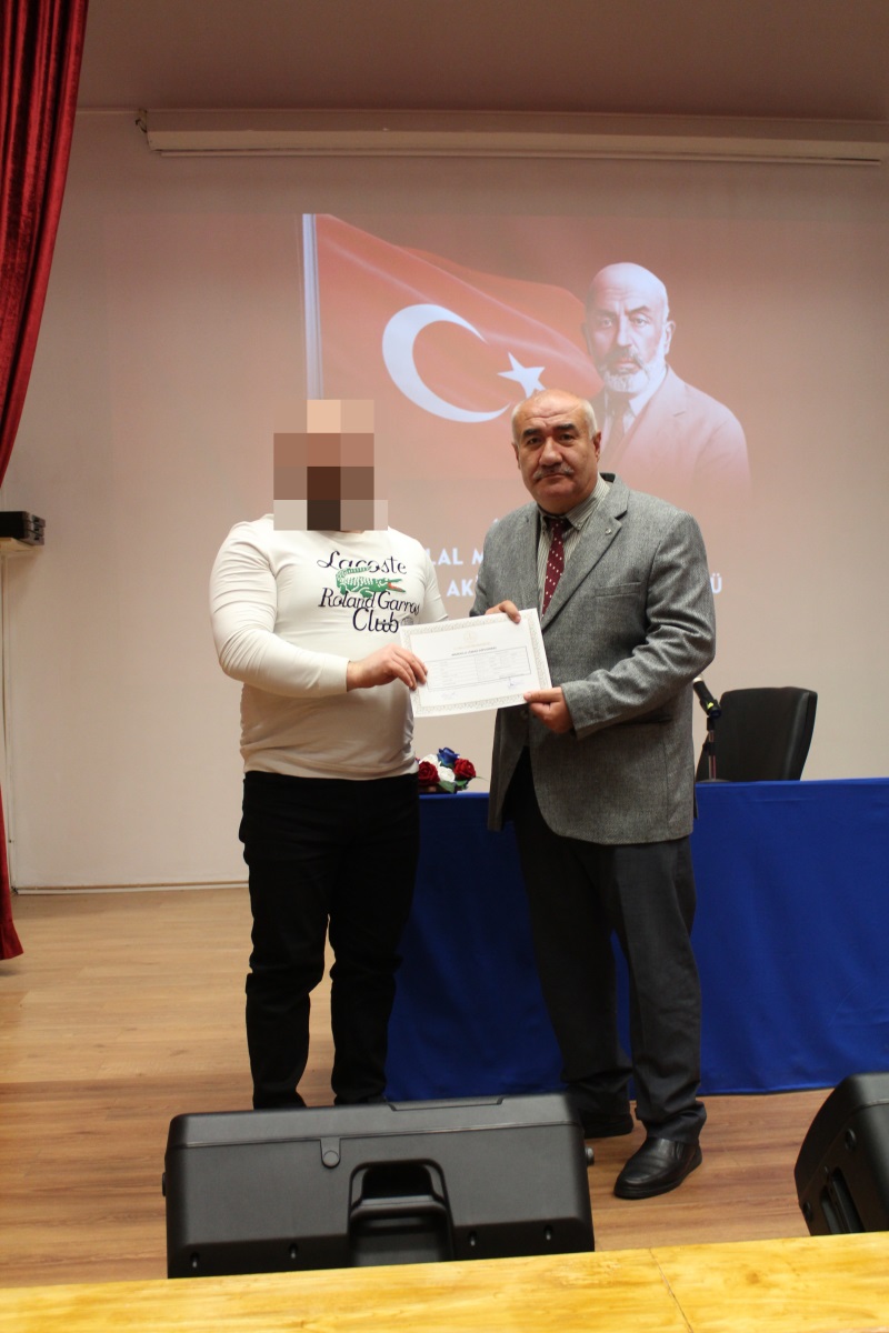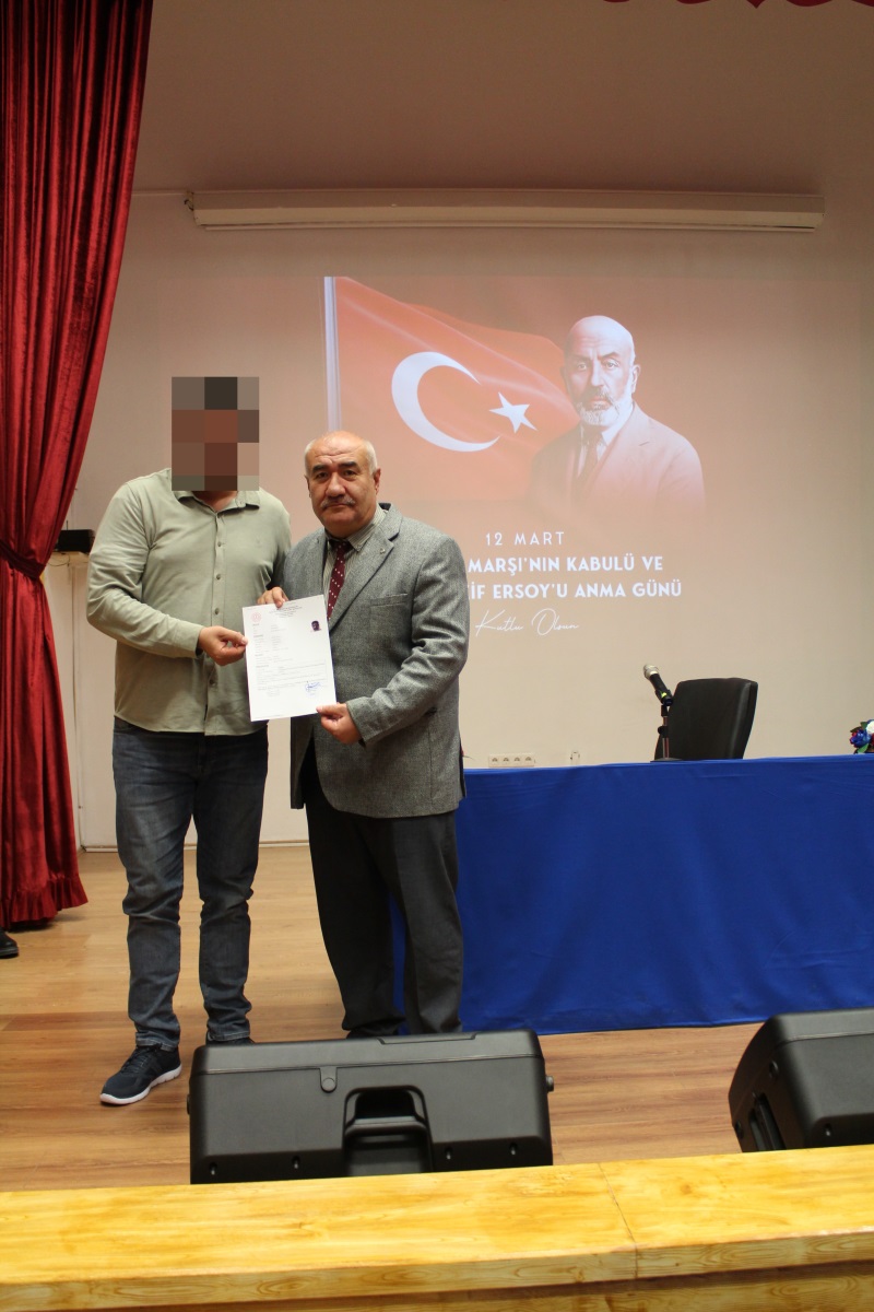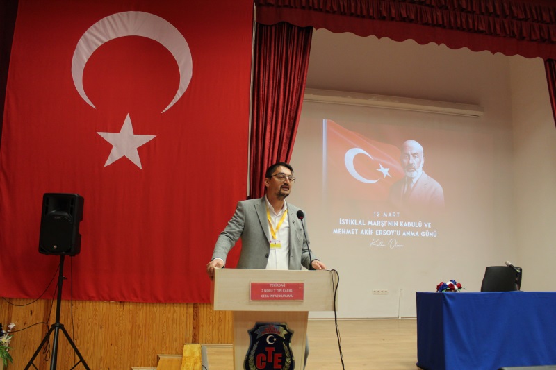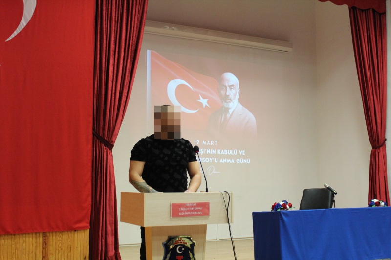 Saygı duruşu ve İstiklal Marşı ile başlayan programda, İstiklal Marşı’nın yazılma sürecini anlatan kısa film gösterimi yapılmış, ardından kurumumuzda tutuklu ve hükümlülere yönelik düzenlenen İstiklal Marşını Güzel Okuma Yarışması’nın birincisi İstiklal Marşı’nı coşkuyla kürsüde okumuştur. Aynı zamanda kurumumuzda ortaöğretimlerini başarı ile tamamlayarak mezun olan öğrencilerimize kurum ikinci müdürü Cemalettin ŞAHİN tarafından diplomaları teslim edilmiştir. Akabinde Namık Kemal Üniversitesi Türk Dili ve Edebiyatı Bölümü Arş. Gör. Dr. Enes İLHAN günün anlam ve önemine ilişkin konuşmasını yapmış ve fotoğraf çekimi ile program tamamlanmıştır.